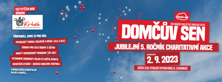 DOMČŮV SEN, z.s. společně s Nadačním fondem dětské onkologie Krtek by Vás rádi pozvali na jubilejní 5. ročník charitativní fotbalové akce, jejíž součástí budou dva souběžně hrané turnaje – chlapecký a dívčí.