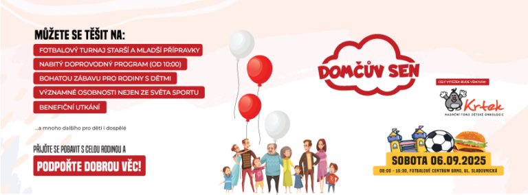 Spolek DOMČŮV SEN společně s Nadačním fondem dětské onkologie Krtek by Vás rádi pozvali na 7. ročník charitativní fotbalové akce, jejíž součástí bude tradiční chlapecký a dívčí turnaj pro kategorii U11+WU13 a také turnaj pro mladší přípravku kategorii U8+WU9.
